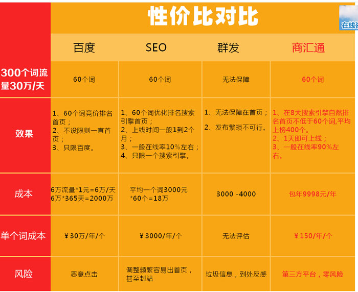 1、網(wǎng)絡(luò)營銷成為新時代的寵兒!互聯(lián)網(wǎng)的發(fā)展,讓越來越多的人開始重視并選擇網(wǎng)絡(luò)營銷推廣!網(wǎng)絡(luò)營銷大大改變了企業(yè)的營銷方式! 二.企業(yè)網(wǎng)站宣傳推廣新助手-商匯通 "商匯通"是國內(nèi)首家專注于搜索引擎首頁精準營銷的電子商務云銷平臺,整合公司8年技術(shù)積累和優(yōu)秀合作平臺,幫助客戶實現(xiàn)成百上千個精準關(guān)鍵詞自然排名8大搜索引擎首頁,方便、快捷、穩(wěn)定實現(xiàn)企業(yè)搜索引擎推廣。 三.選擇我們的十大理由 1、五大搜索引擎首頁排名推廣!